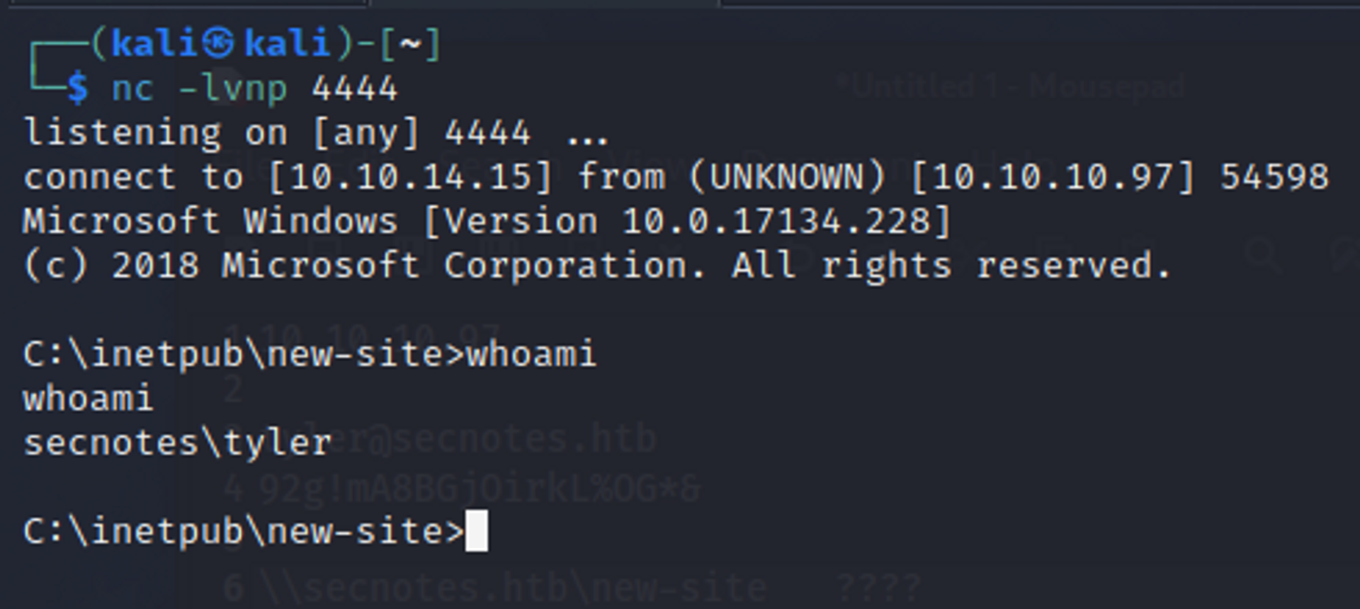 So i went ahead and tried those credentials on the SMB server. Which worked. I was only able to access the smb share “new-site”. Which instantly clicked to me, Its the IIS webserver, and i can possible put a malicious file into the smb share and execute it for a reverse shell. Which is what i basically did.